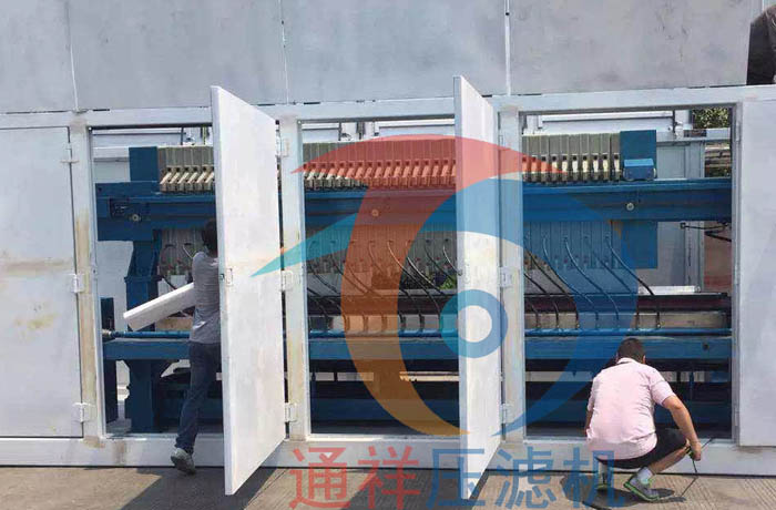 待水龍頭不出水時,關(guān)閉壓榨泵控制開關(guān),使高壓泵停止工作,將放水閥門開啟,使壓濾機膜板中的高壓清水全部流出。(注:高壓水未排出前不得松開濾板卸渣,避免膜板崩裂),待膜板中清水完全流出后,開啟輸送機控制開關(guān),輸送系統(tǒng)正常啟動后,打開膜板退回控制開關(guān),壓緊膜板自動退回到限定位置停止后,拉板小車自動拉板,進(jìn)行卸料。