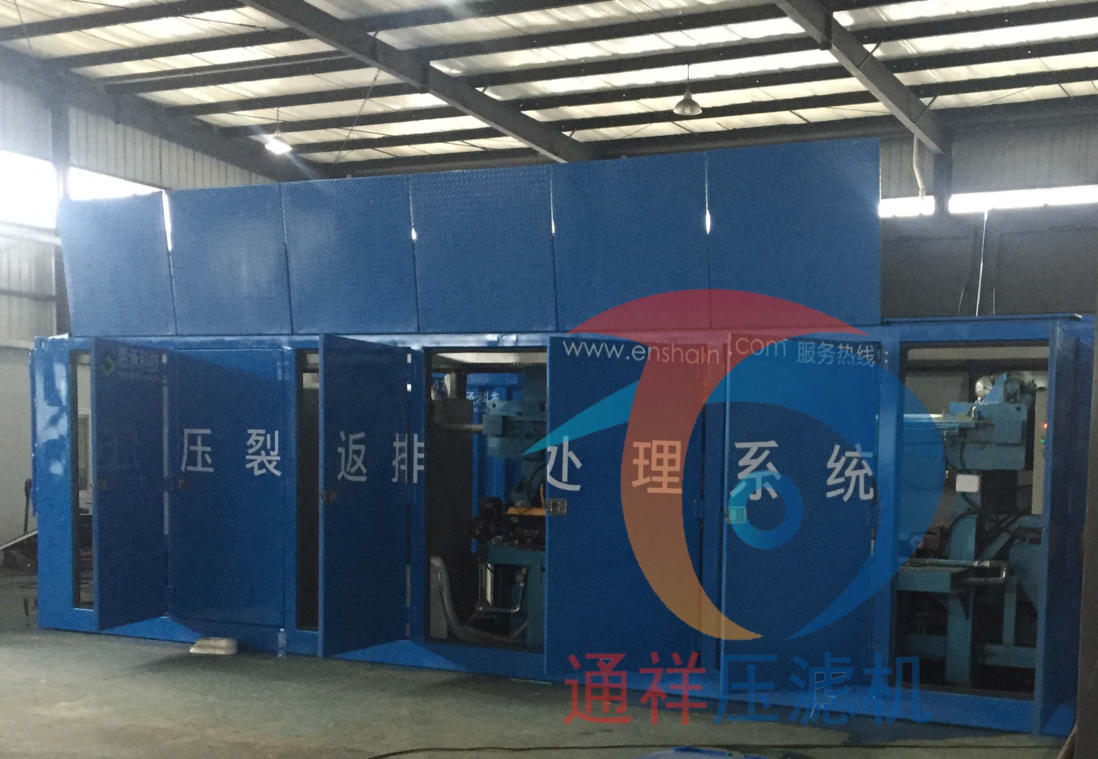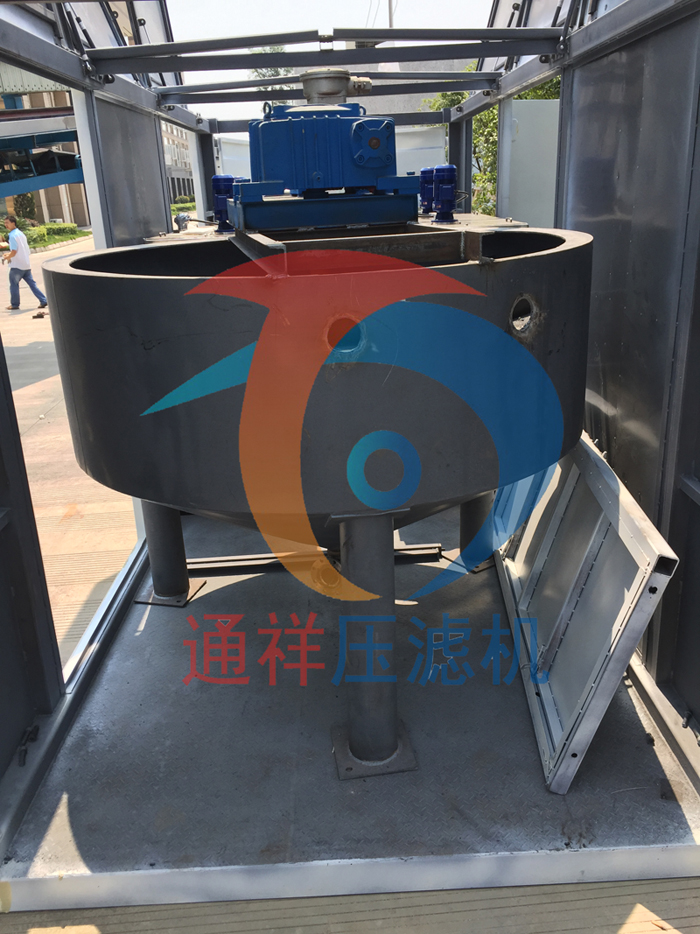 本設備主要由主機、車載式工作臺、下料斗、皮帶輸送機、濾液緩存罐、自動控制裝置等組成。主機由機架、濾板、快開拉板裝置、液壓站、自動控制柜等組成。